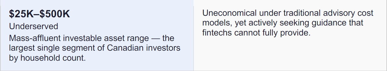 A generation of Canadians in their 20s, 30s, and early 40s is accumulating wealth through digital first platforms. They are not waiting to reach $1 million in investable assets to demand guidance. When advisors decline $100,000 households today, those households do not return later. They build financial habits, tax-filing relationships, savings flows, and investing routines elsewhere. Over time, inertia flips. The fintech becomes the incumbent. The independent channel becomes the outsider.