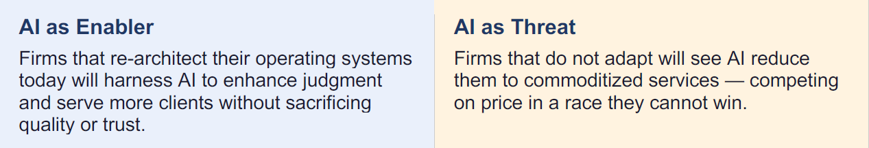 This creates a paradox that most of the industry has not yet reckoned with. At the very moment AI expands the capacity to serve more clients, it is also commoditizing the activities that advice was built around. The firms that simply automate what they already do will find themselves doing it faster, cheaper, and for less revenue.